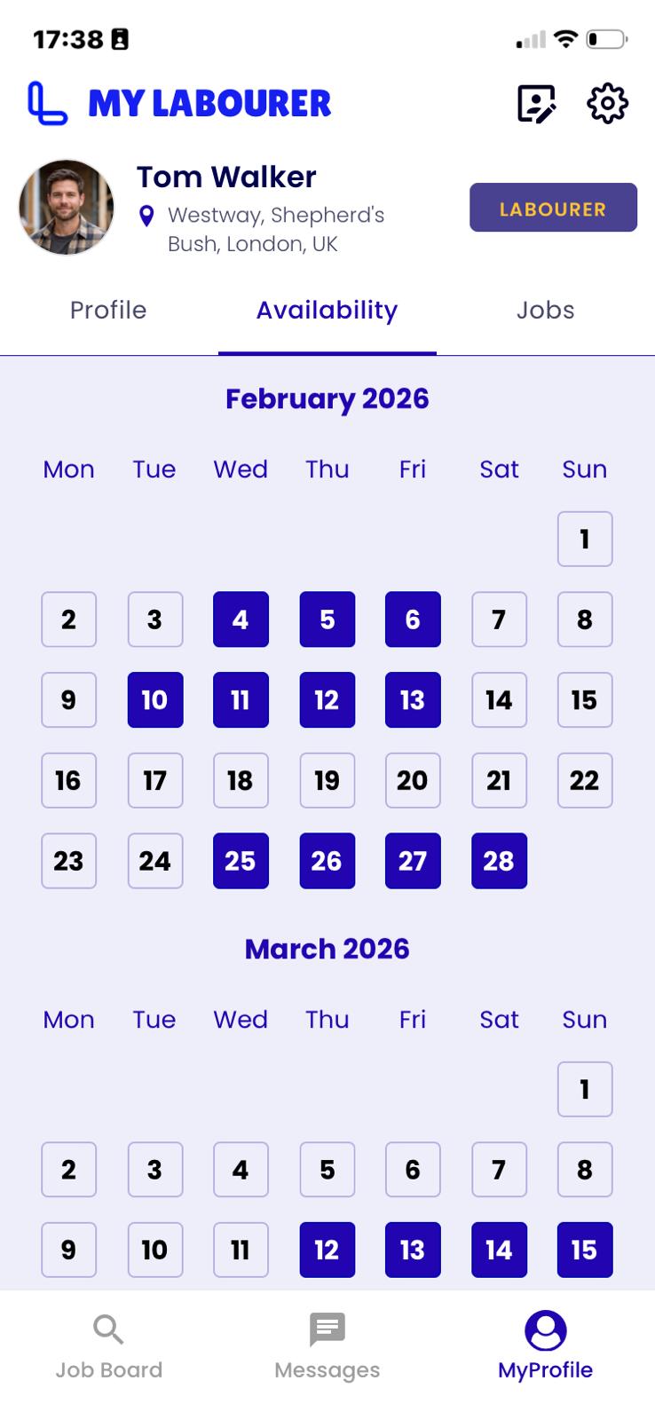 Use the built-in calendar to mark the days you're free to work. Employers only see labourers who are available, helping you get hired faster with no back-and-forth.